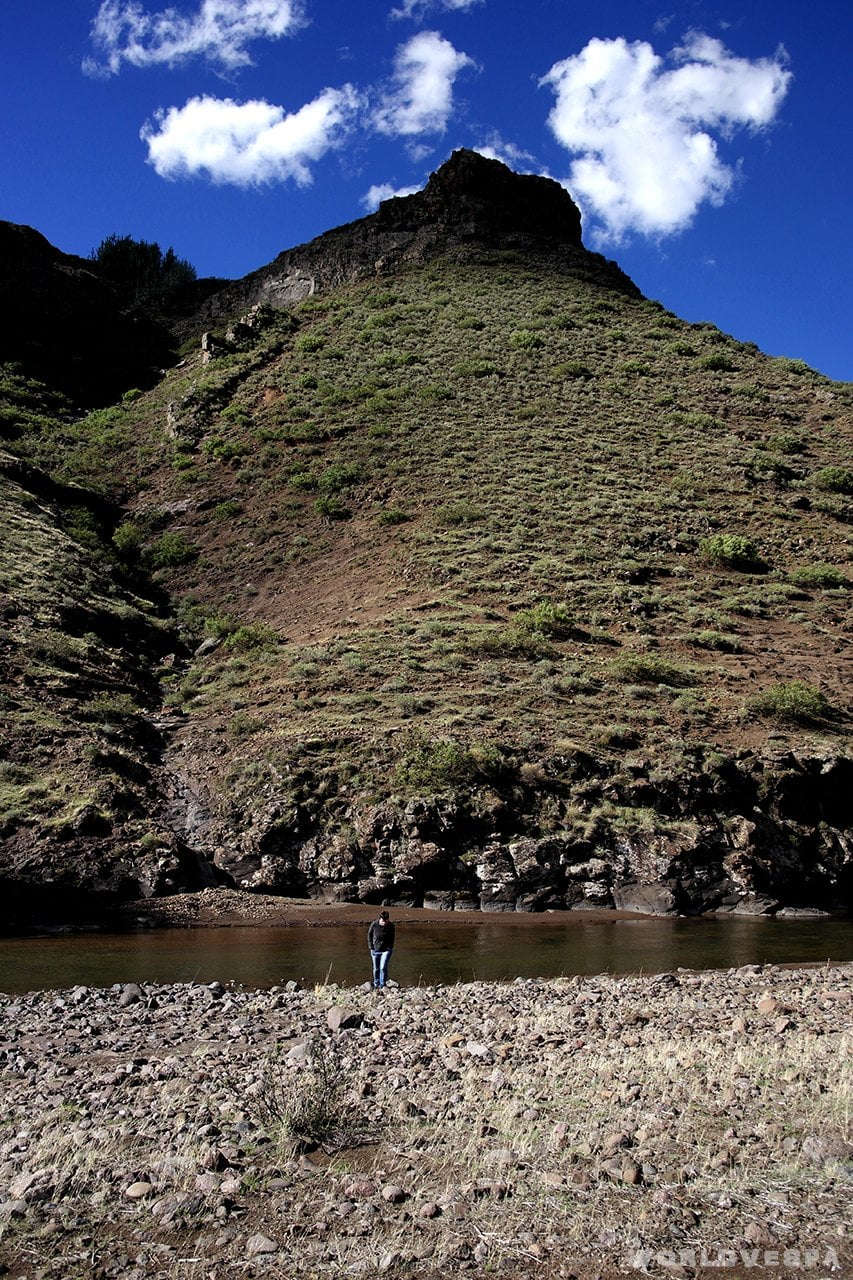 Our third day in Lesotho was the best one! From Ha Lejone (the village where we spent the night) we crossed Katse Dam and we got to Thaba Tseka (a small town) and then to the most beautiful part of our route. The nature was absolutely at its best and it is impossible to find any words to describe the beauty of the landscape…the only thing that we managed to say was “Wow!” or “Oh, wow!”. Our eyes were wide open to see as much as we could and our jaws dropped! That day ended in the best possible way. We found a place to pitch our tent and spend the night and probably it was one of the most beautiful places (if not the most beautiful) I have ever seen in my life: in a remote area, next to a small river and surrounded by the high mountains. Perfect!
