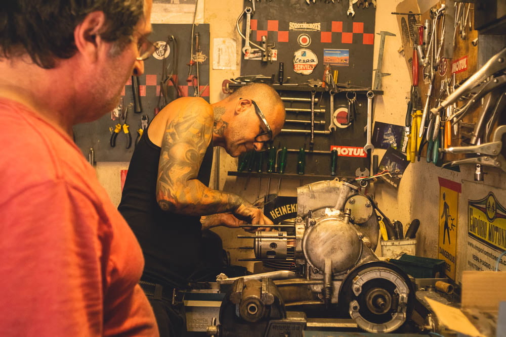 It was Sunday afternoon when Marcio, the president of the scooter club sent us a brief message: “I'm coming over”. Not more than 30 minutes later, three guys came. Tattoos covered their arms and probably most parts of their bodies, their scooters were so shiny that one wouldn't dare to ride them wearing their old clothes and dusty shoes. “Let's go get your scooter out of the room!”. Stairs, instructions given out loud, some swearing in Portuguese about how heavy the scooter is etc... “Caralho, we made it!”. Ten minutes later, Kitsos was standing next to the other scooters waiting to take us for a ride after all this time. The first ride was short but at least we made it to the mechanic's! A few days ago, one rainy afternoon when we couldn't do much but stay indoors, Stergios' patience ended and he decided to see for himself if Kitsos' engine still worked. He pushed the scooter to the main room of the Scooteria poured some gasoline to the thirsty tank and tried to kick-start it. After a few attempts Kitsos' weak engine roared and started working, hiding us behind a cloud of blue-grayish smoke. “I knew it!” Stergios shouted with enthusiasm. So, when he kick-started it again in front of the Scooteria he was sure that his trusty scooter would make it.