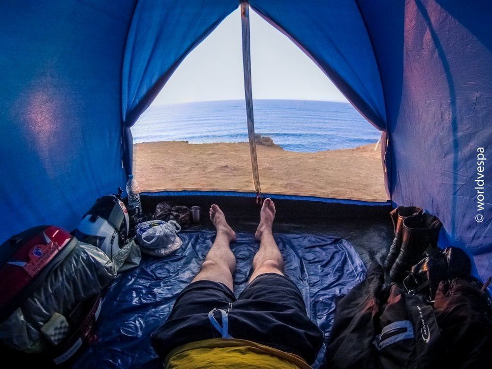 Where should we park them for the night? The idea was to take all the luggage up in the room with us and leave the vespas parked outside the hotel. But the moment we said that, a bunch of kids arrived running and started playing with our vespas and our stuff, wearing our helmets and trying to make profit from us in any way they could imagine! “That’s why I don’t think it’s a good plan” Thanos told me and I totally agreed with him. Even the lady who was working at the hotel was yelling at those kids to leave us alone, frightened that she would lose her customers. They seemed more than spoiled kids making fun of us and unfortunately, we had to leave the place. So now, my idea was to continue on our vespas with the hope that we could find a nice remote spot to pitch our tents far from the eyes of others, maybe somewhere next to the Atlantic ocean…and that’s what happened: we found the best spot and spent the night in our tents watching the most beautiful sunset until that time!