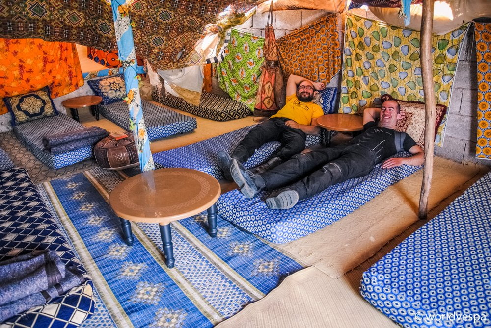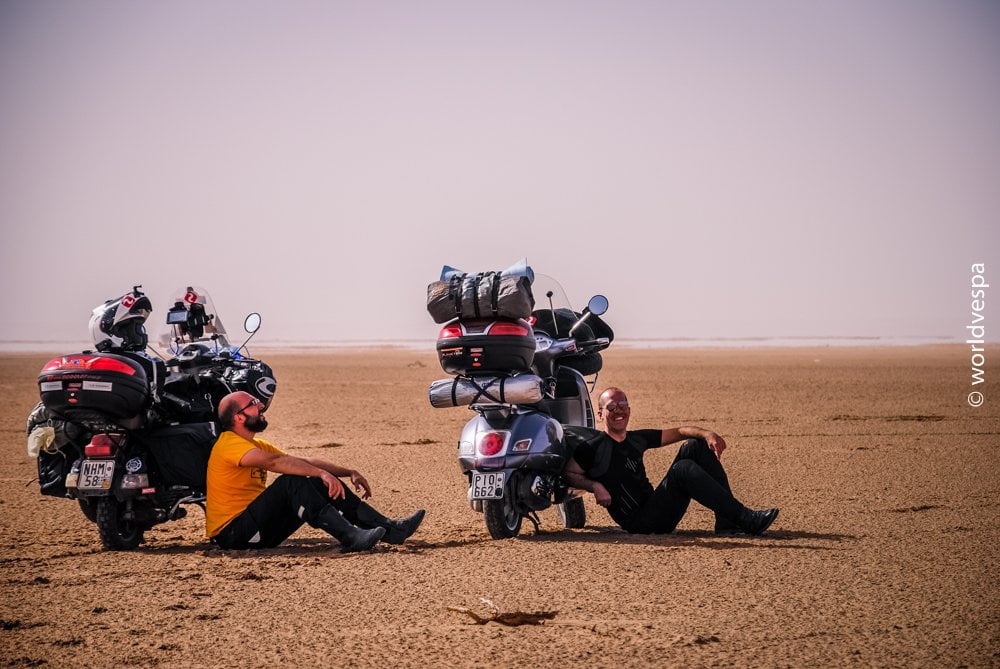 The next night again we stayed in our tents, not far from the town of Dakhla, in a really beautiful place were many people from Europe come with their caravans to stay for the winter! A German guy who was living there told us that this place, due to the strong winds in the area, is ideal for kite-surfing and fishing. The fish in that part of the sea are big and delicious. Before we got to that place we didn’t know anything about, we had met a guy from Korea riding a Yamaha YBR125, who was the one who gave us information about where to find it. He shared with us all of his adventures at the borders of Senegal, as he was returning from his trip (Paris – Dakar) and he told us that he had met a couple from Greece traveling on two enduro motorcycles. We were asking ourselves who could they be those two Greeks and then he told us: “Madnomad”!