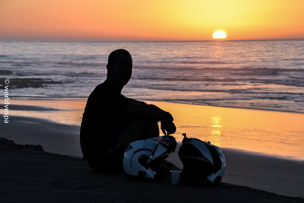 Where should we park them for the night? The idea was to take all the luggage up in the room with us and leave the vespas parked outside the hotel. But the moment we said that, a bunch of kids arrived running and started playing with our vespas and our stuff, wearing our helmets and trying to make profit from us in any way they could imagine! “That’s why I don’t think it’s a good plan” Thanos told me and I totally agreed with him. Even the lady who was working at the hotel was yelling at those kids to leave us alone, frightened that she would lose her customers. They seemed more than spoiled kids making fun of us and unfortunately, we had to leave the place. So now, my idea was to continue on our vespas with the hope that we could find a nice remote spot to pitch our tents far from the eyes of others, maybe somewhere next to the Atlantic ocean…and that’s what happened: we found the best spot and spent the night in our tents watching the most beautiful sunset until that time!